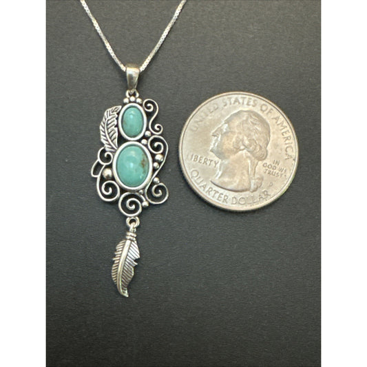 18” New Condition Sterling Silver Genuine Turquoise Feather Pendant Necklace