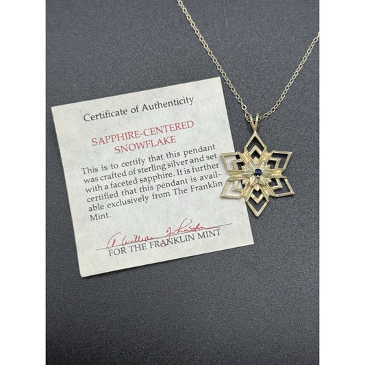 1984 Sterling Silver Franklin Mint Sapphire Snowflake Pendant Necklace P3