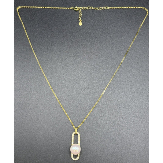 18” New Condition Gold S.S. Genuine Pearl Moissanite Modernist Pendant GRA