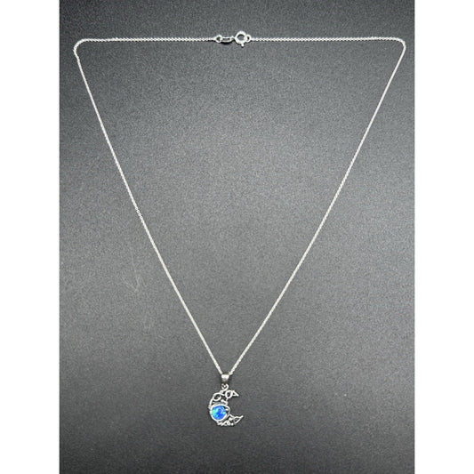 18” New Condition Sterling Silver Lab Blue Opal Artisan Crescent Moon Pendant