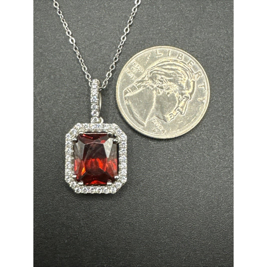 18” Sterling Silver Red CZ Halo Pendant Necklace 925 T27