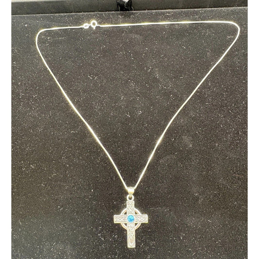 New Condition 18" Sterling Silver Lab Blue Opal Celtic Cross Necklace