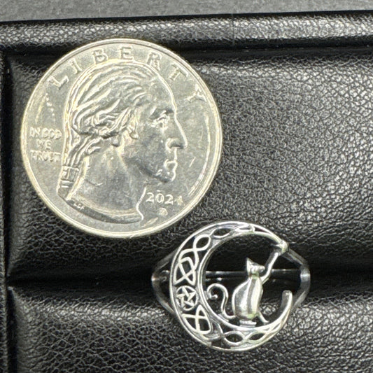 New Condition Sterling Silver Kitty Cat Crescent Moon Ring 925 Size 7 R01