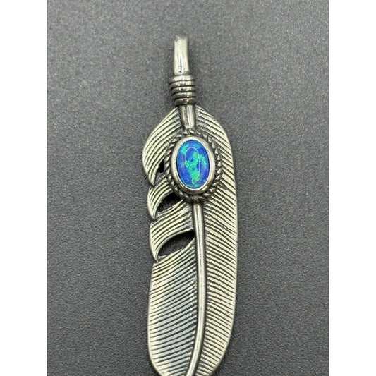 New Condition Sterling Silver Lab Blue Opal Feather Pendant 925 Free Shipping