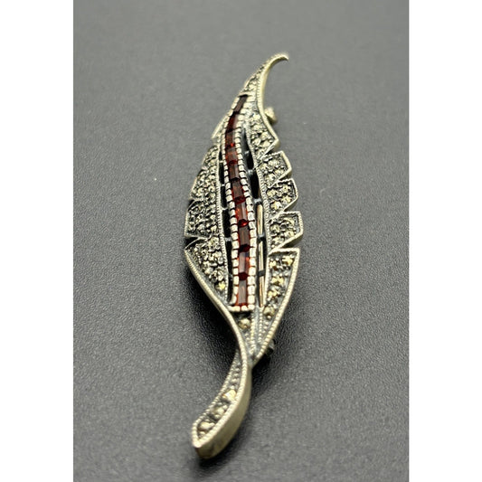 Vintage Sterling Silver Marcasite Red Gem Leaf Brooch Pin 8 Grams W18