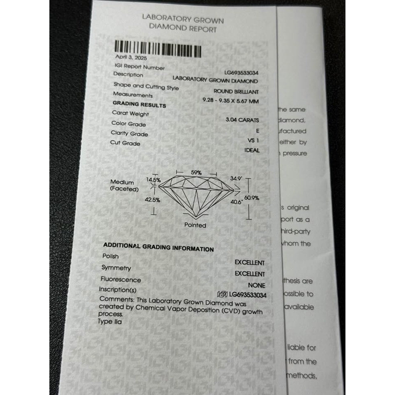 3.04 carat weight round brilliant cut lab grown diamond. E color VS1 clarity. IGI lab report.