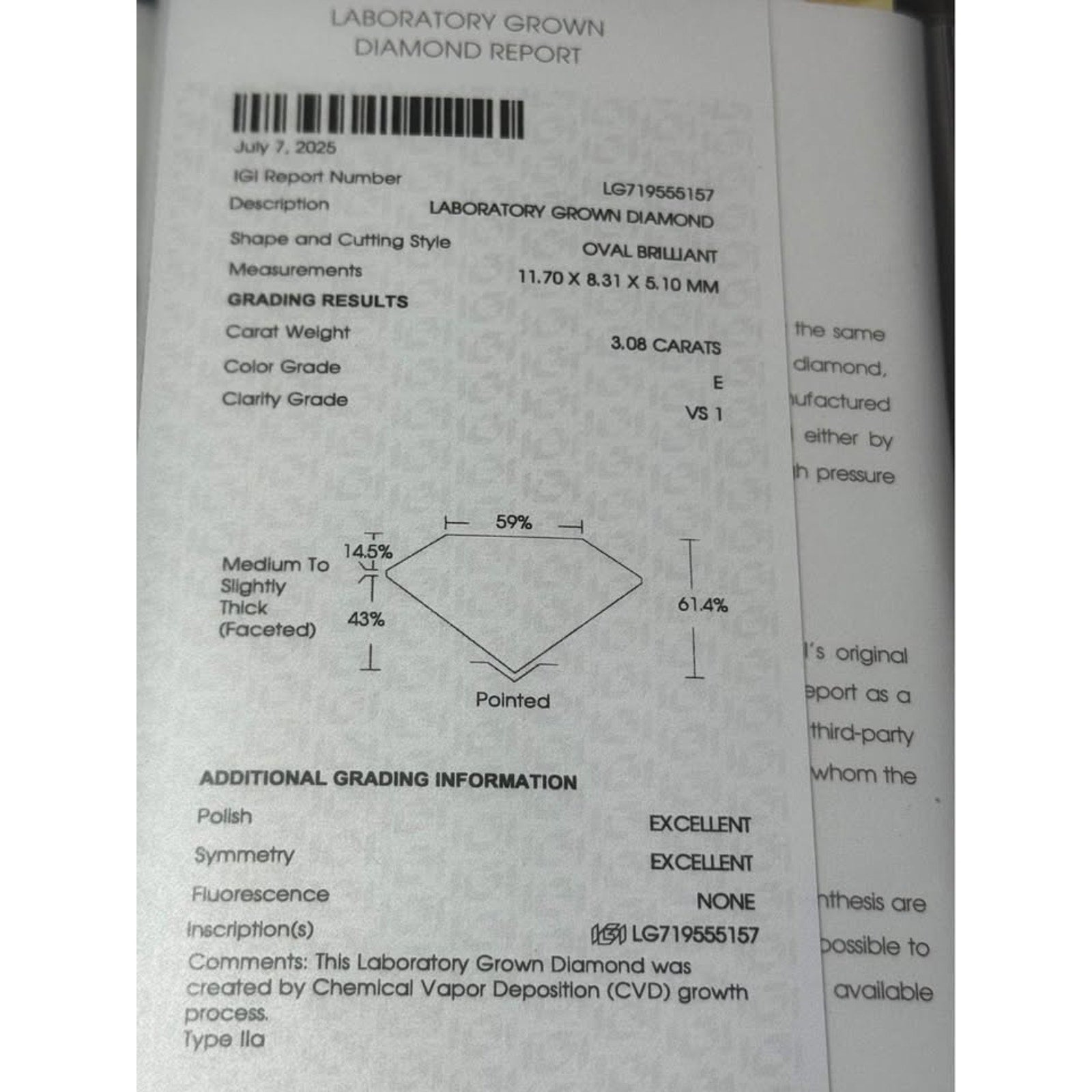 3.08 carat weight Oval lab grown diamond. E color VS1 clarity. IGI lab report.