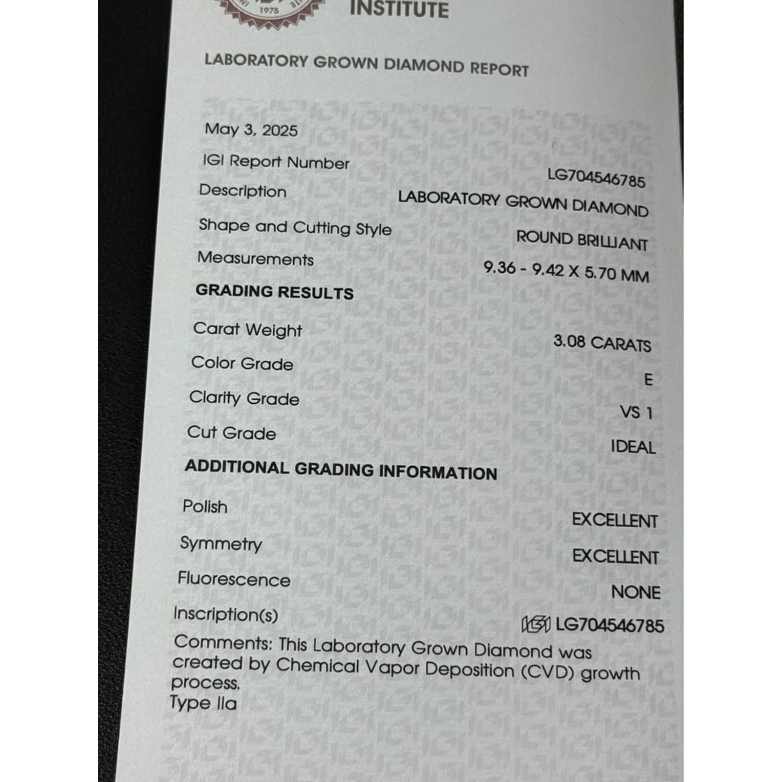 3.08 carat weight Round Brilliant lab grown diamond. E color VS1 clarity. IGI lab report.