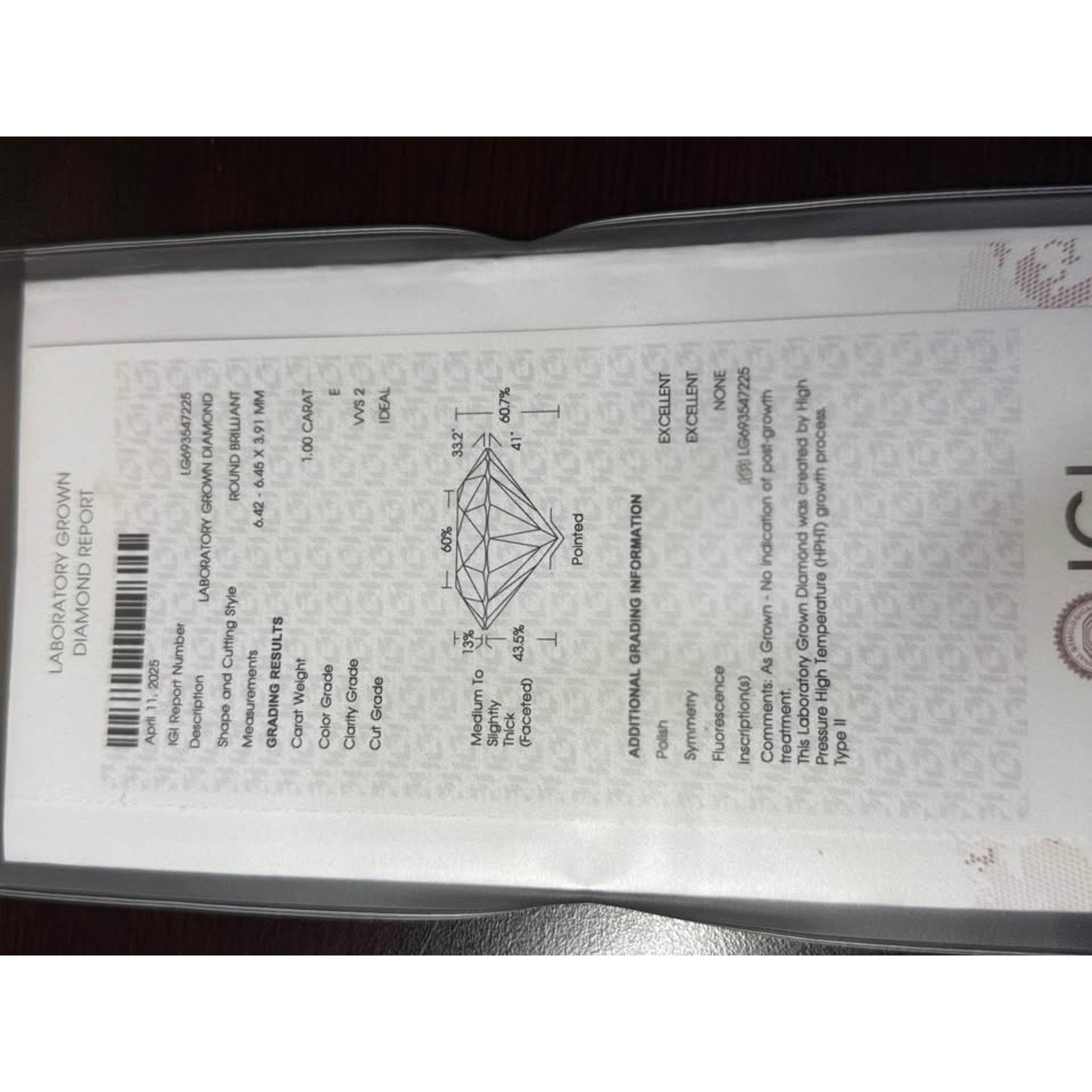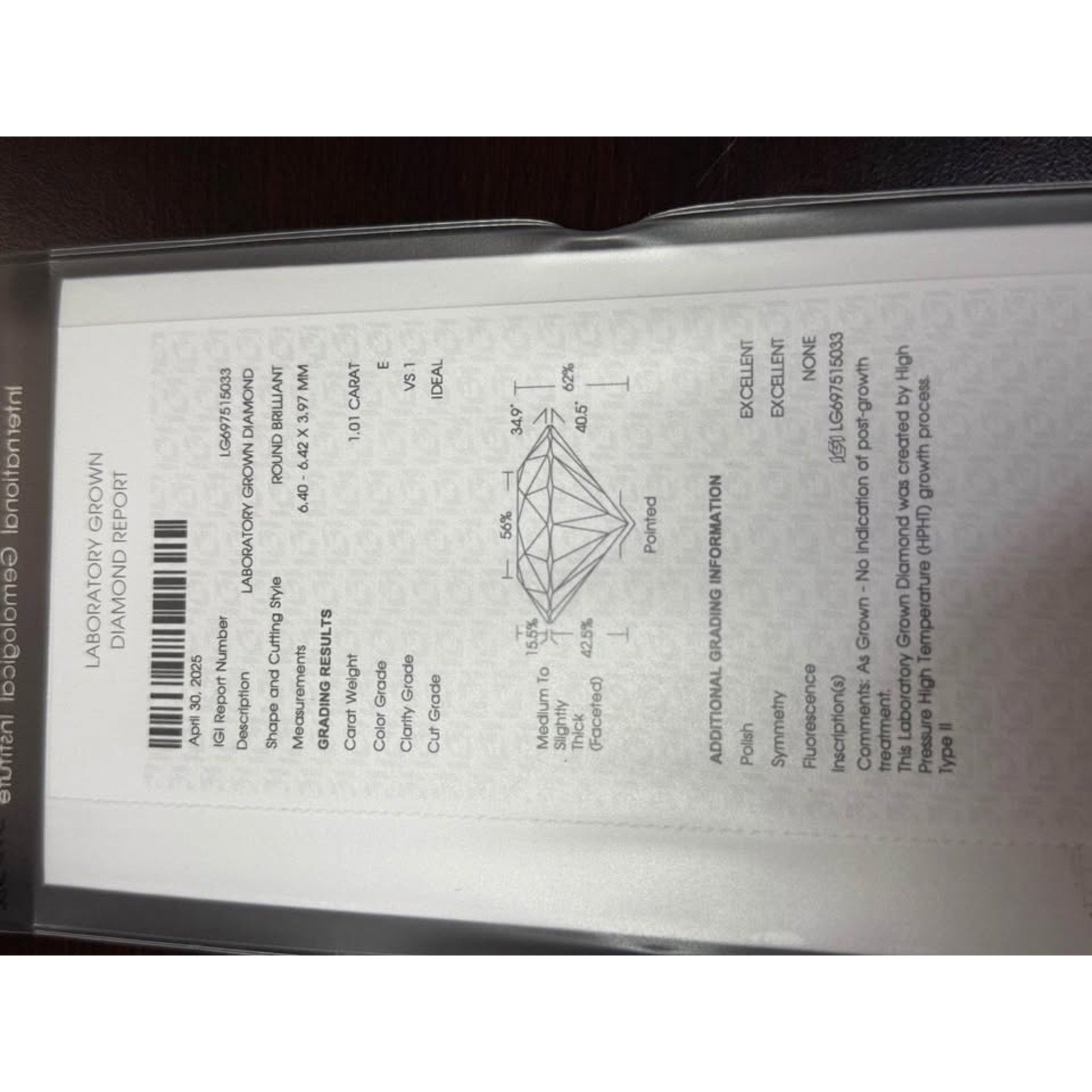 2.01 carat weight round lab grown diamond. E color VS1/VVs2 clarity. IGI lab report.