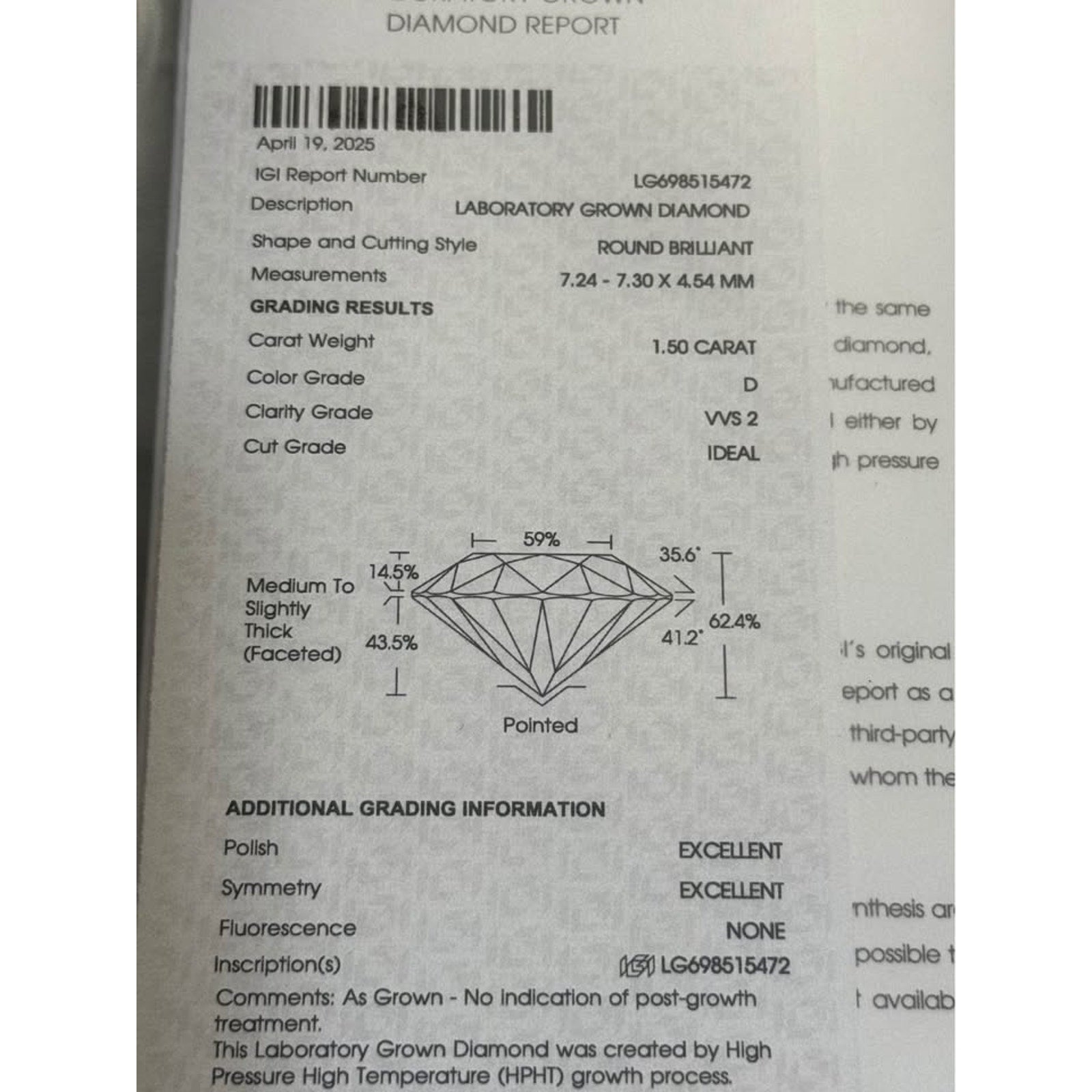 3.00 total carat weight Round Brilliant lab grown diamonds. D color VVS2 clarity. IGI lab report.