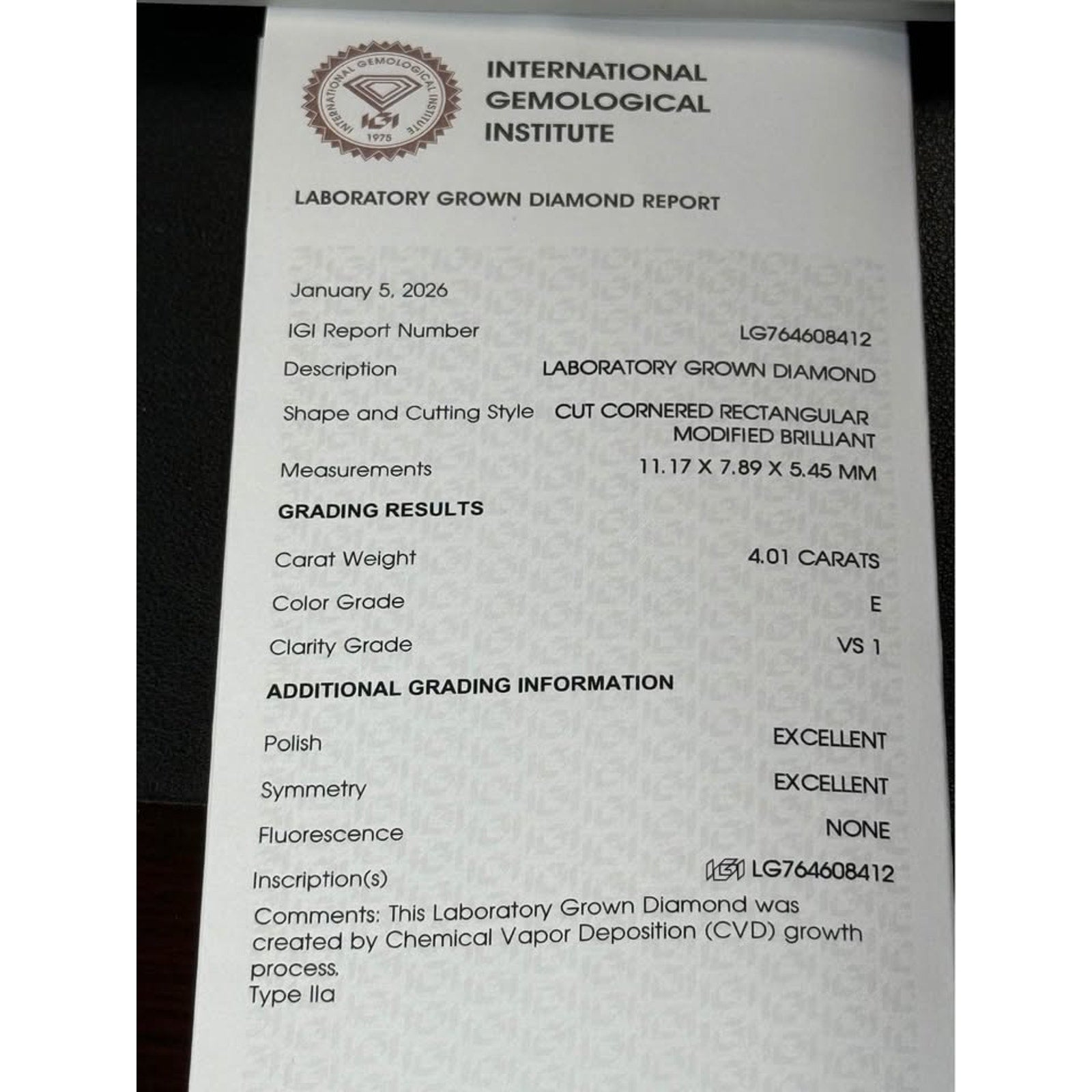 💎4.01 carat weight Radiant lab grown diamond. E color VS1 clarity. IGI lab report.