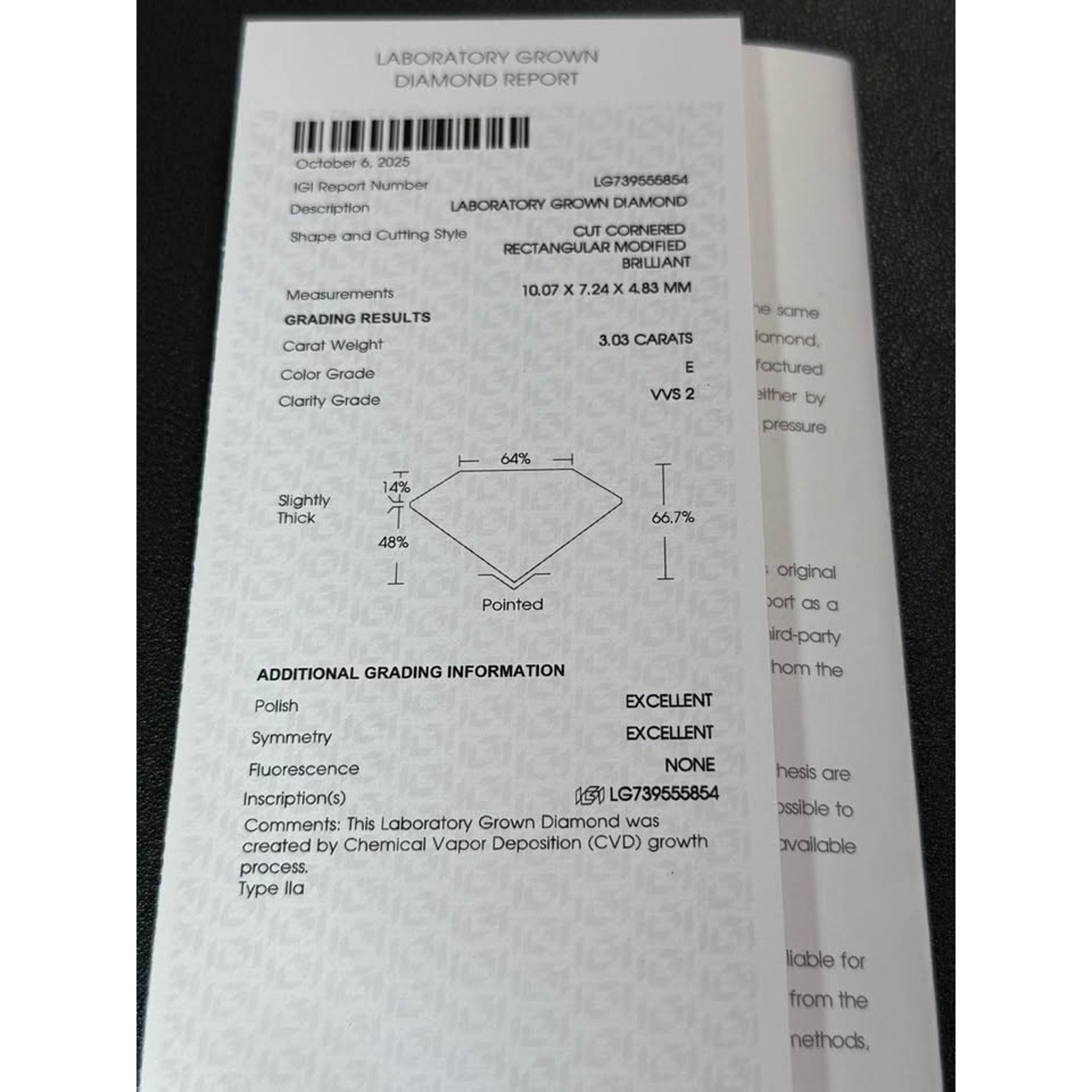 3.03 carat weight Radiant lab grown diamond. E color VVS2 clarity. IGI lab report.