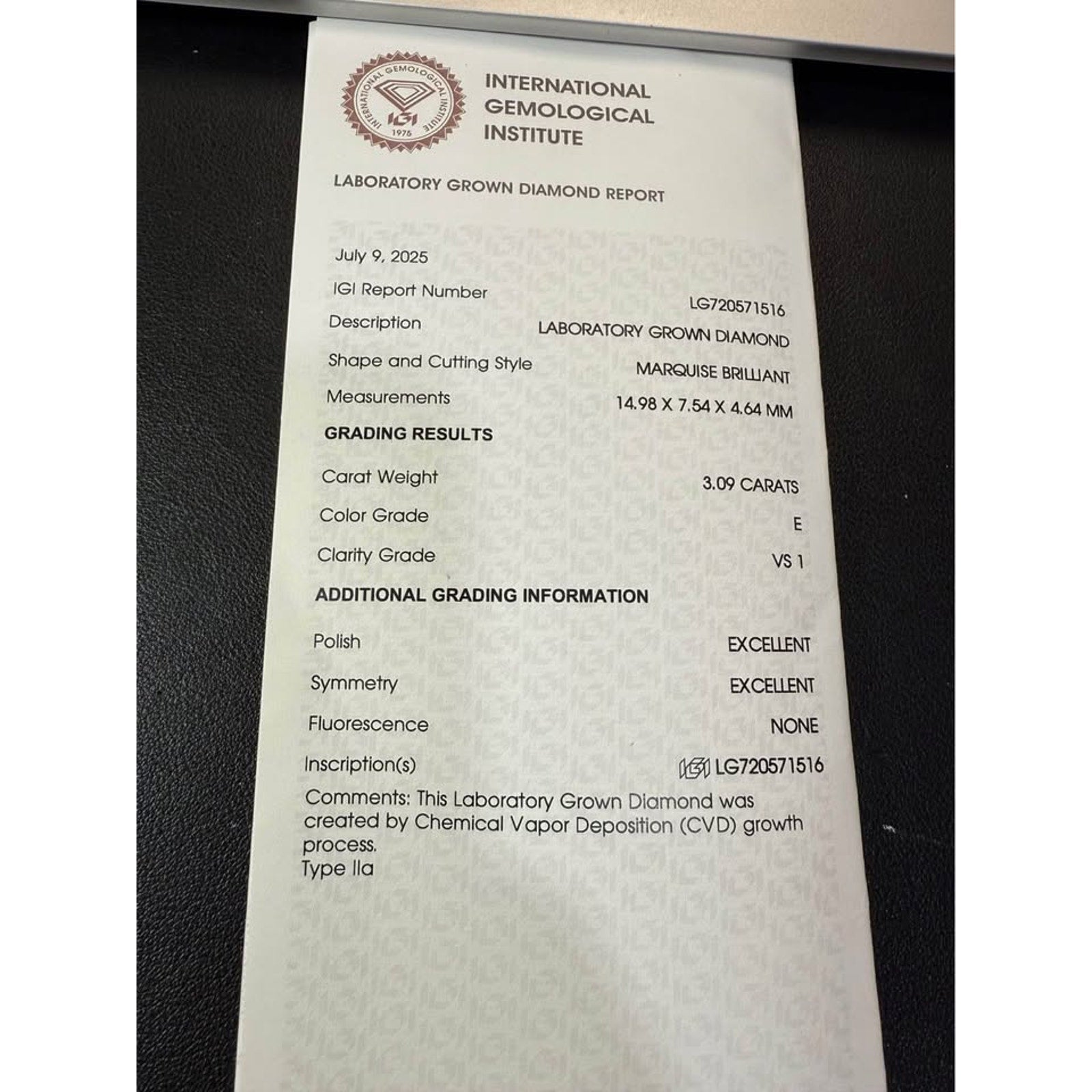 Loose 3.09 carat weight Marquise cut lab grown diamond. E color VS1 clarity. IGI lab report.