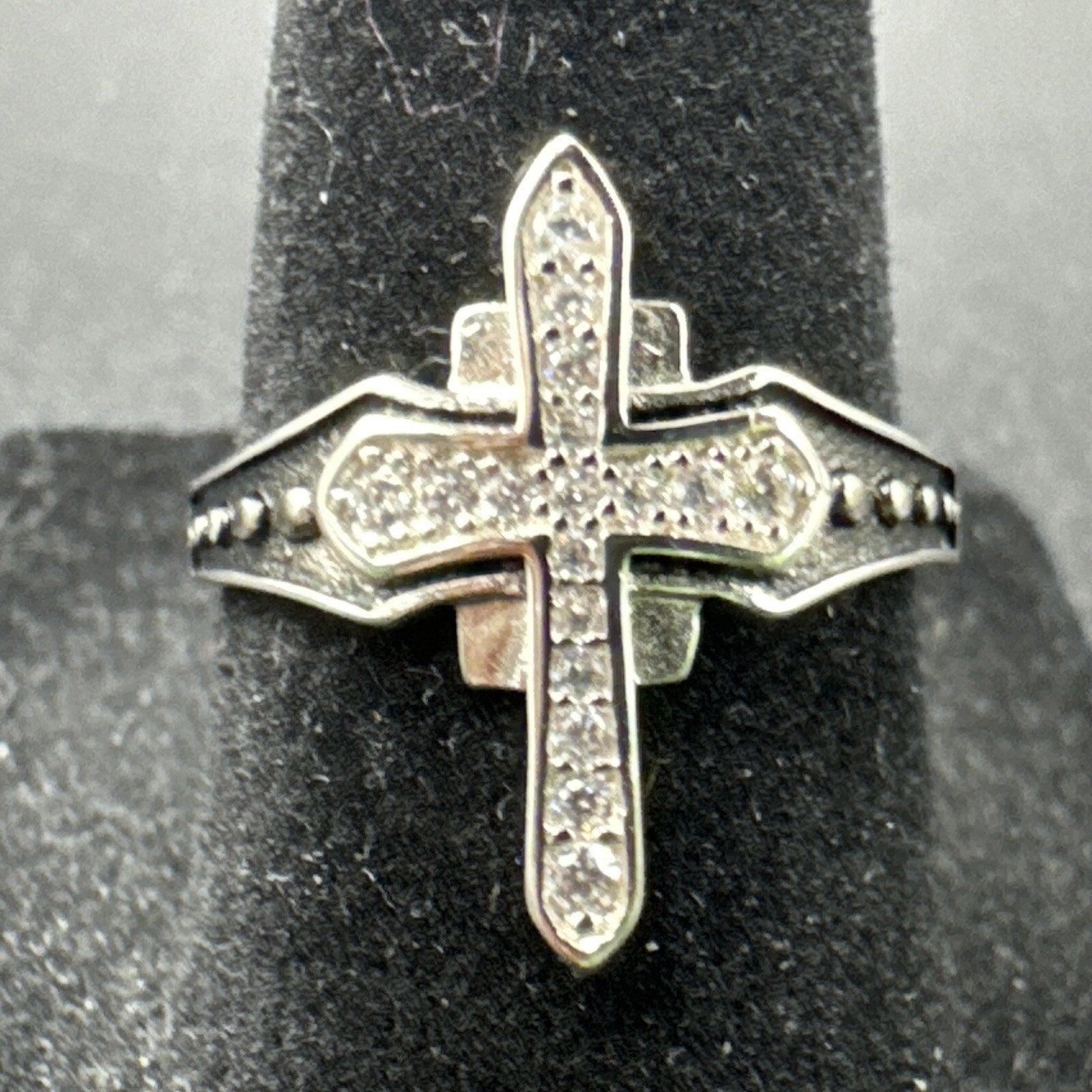 New Condition Sterling Silver CZ Medieval Cross Ring 925 Size 7