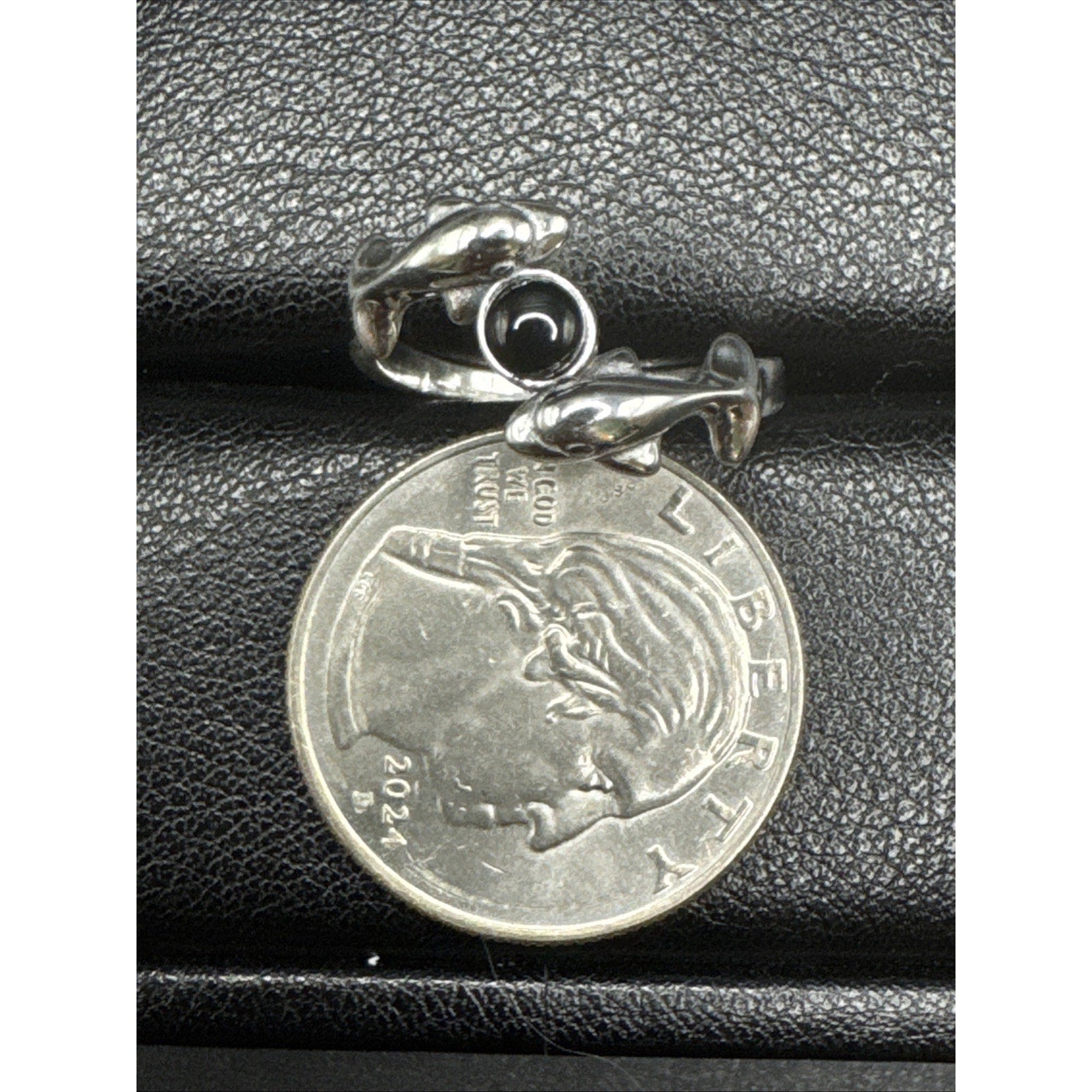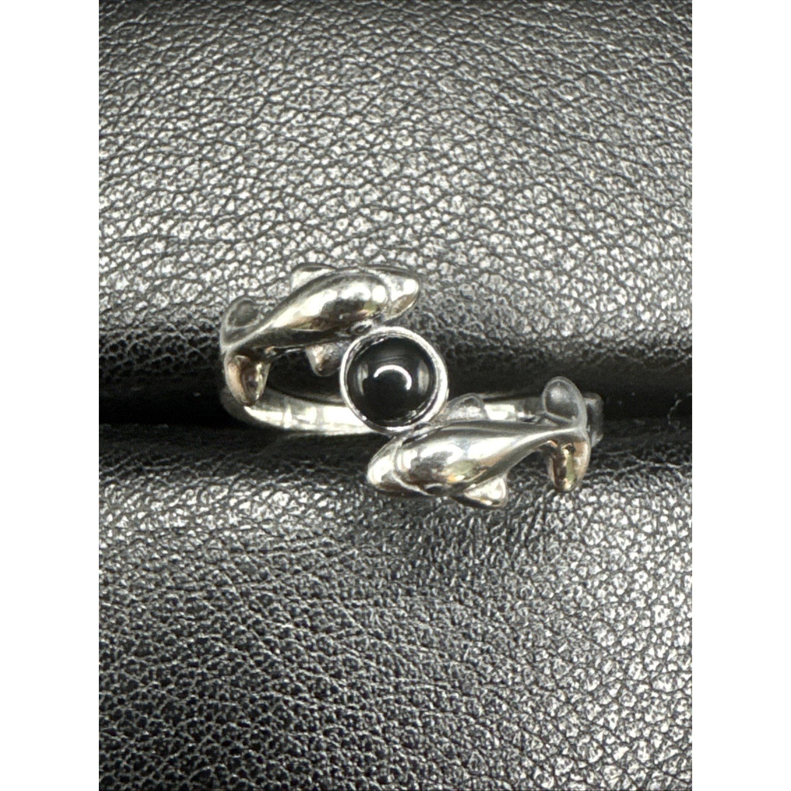 New Condition Sterling Silver Onyx Double Dolphins Ring 925 Size 7