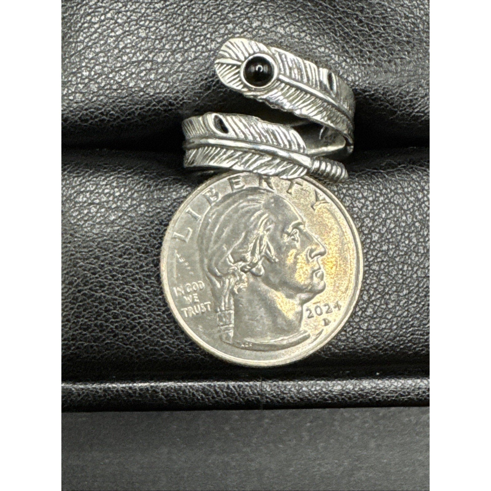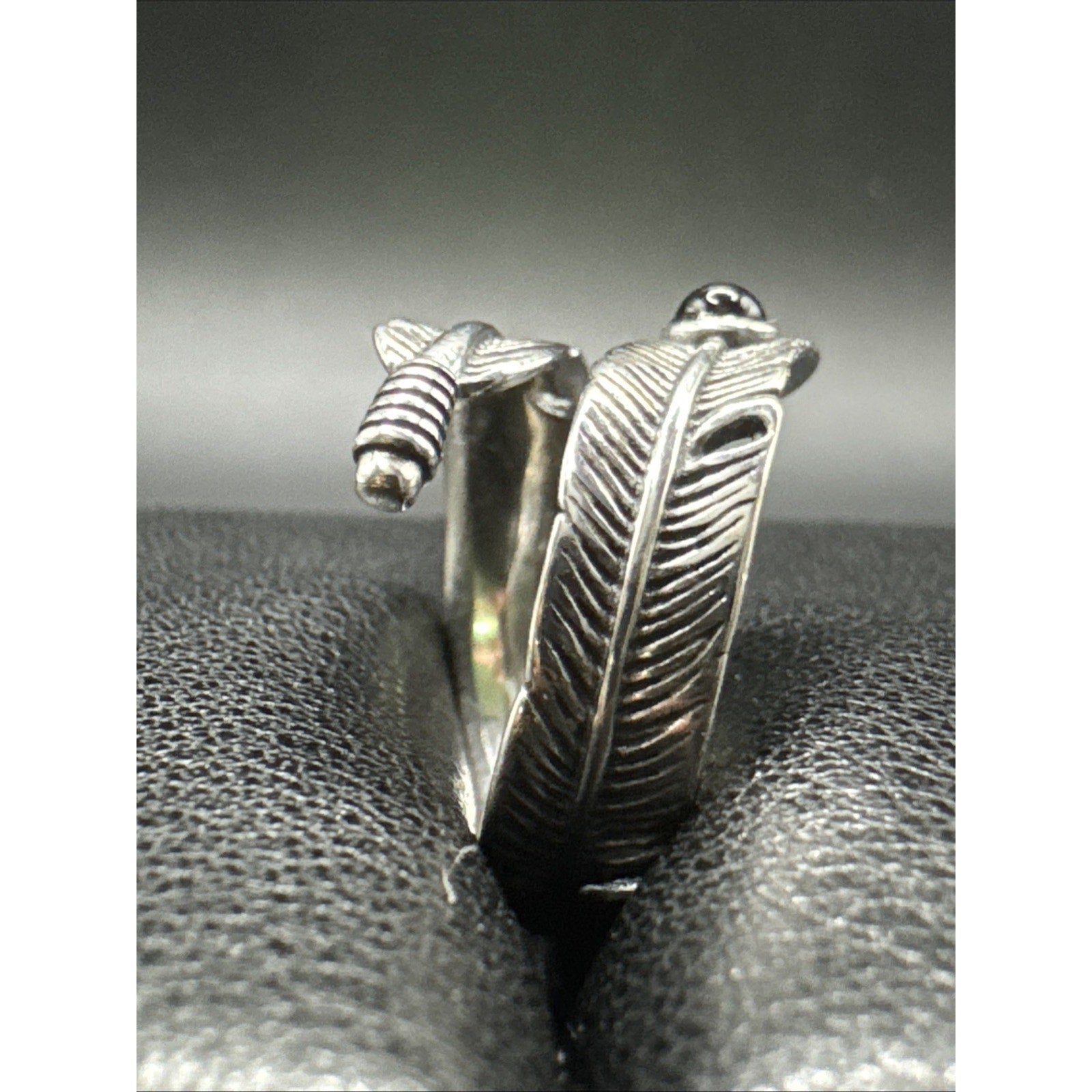 New Condition Sterling Silver Onyx Feather Ring 925 Size 7